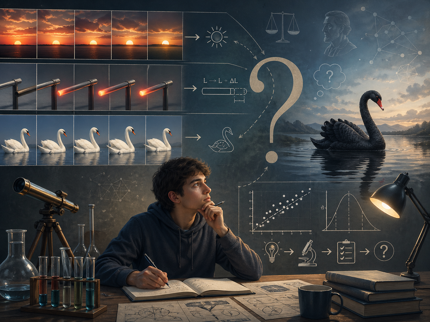 דוגמה מאלפת היא הטענה “כל הברבורים לבנים”. במשך זמן רב באירופה זו נראתה הכללה סבירה, משום שכל הברבורים שהכירו היו לבנים. רק בסוף המאה ה 17, גילוי ברבורים שחורים באוסטרליה הראה שגם תצפיות רבות אינן מבטיחות את נכונותו של כלל מוחלט. גם במדע אפשר לראות את אותו עיקרון: חוק או תיאוריה יכולים להיתמך על ידי ניסויים רבים, ועדיין להידרש לתיקון כאשר מתגלים ממצאים חדשים. כך למשל הפיזיקה של ניוטון הייתה מוצלחת מאוד במשך מאות שנים, אך במצבים מסוימים נדרשו הרחבה ותיקון באמצעות תורת היחסות.